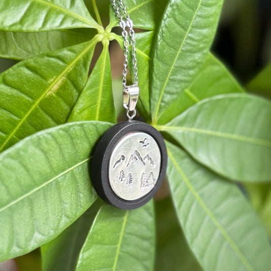 Wood and Silver Hand Stamped Mountain Nature Pendant - Black Wood