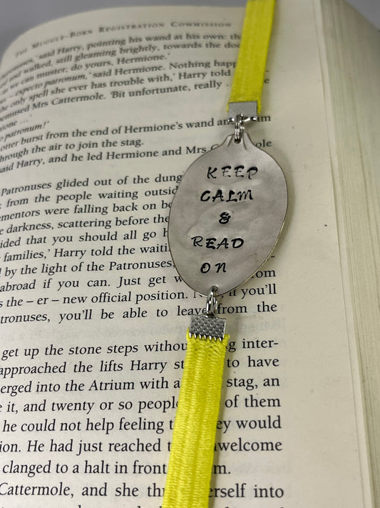 Spoon Metal Bookmark on elastic cord with “Keep Calm and Read On” quote