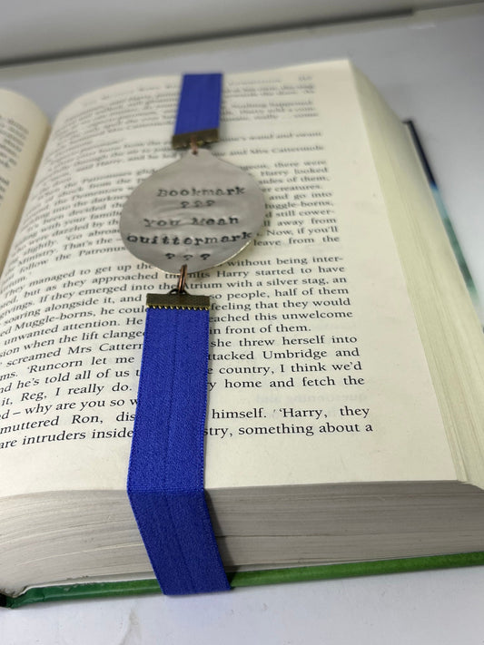 Silver Spoon Bookmark on elastic cord with “Bookmark? You Mean Quittermark” quote