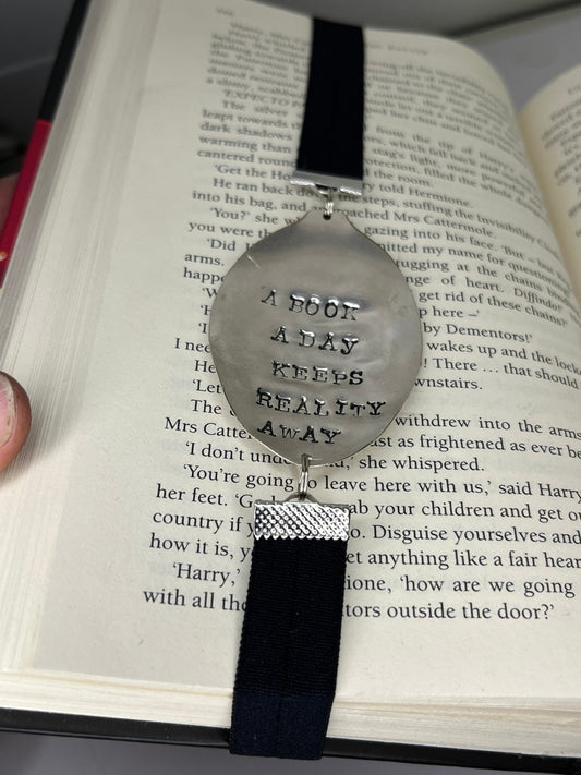 Spoon Metal Bookmark on elastic cord with “A Book a Day Keeps Reality Away” quote