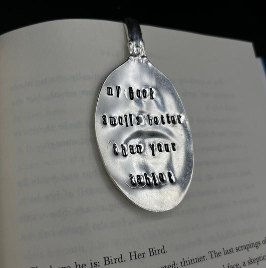 Silver Spoon Bookmark “My Book Smells Better than your Tablet” hand stamped. Book lover gift