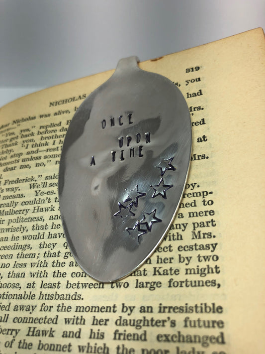 Spoon Bookmark on elastic cord made from a Vintage Spoon with “ ONE MORE PAGE”