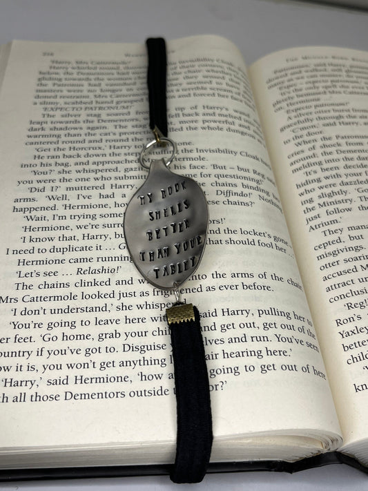 Spoon Metal Bookmark on elastic cord made from a Vintage Spoon with “My Book Smells Better than your Tablet” quote | Gift for Book lover,