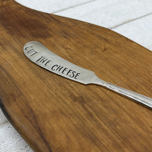 Unique Silver Butter, Cheese or Spreader Knife, Hand stamped from vintage silver plated butter knife with "Cut the Cheese" hand stamped on it. Unique host, wedding or housewarming gift