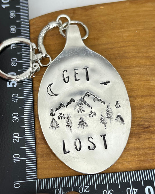 Hand Stamped "Get Lost" Silver Keychain with mountains.