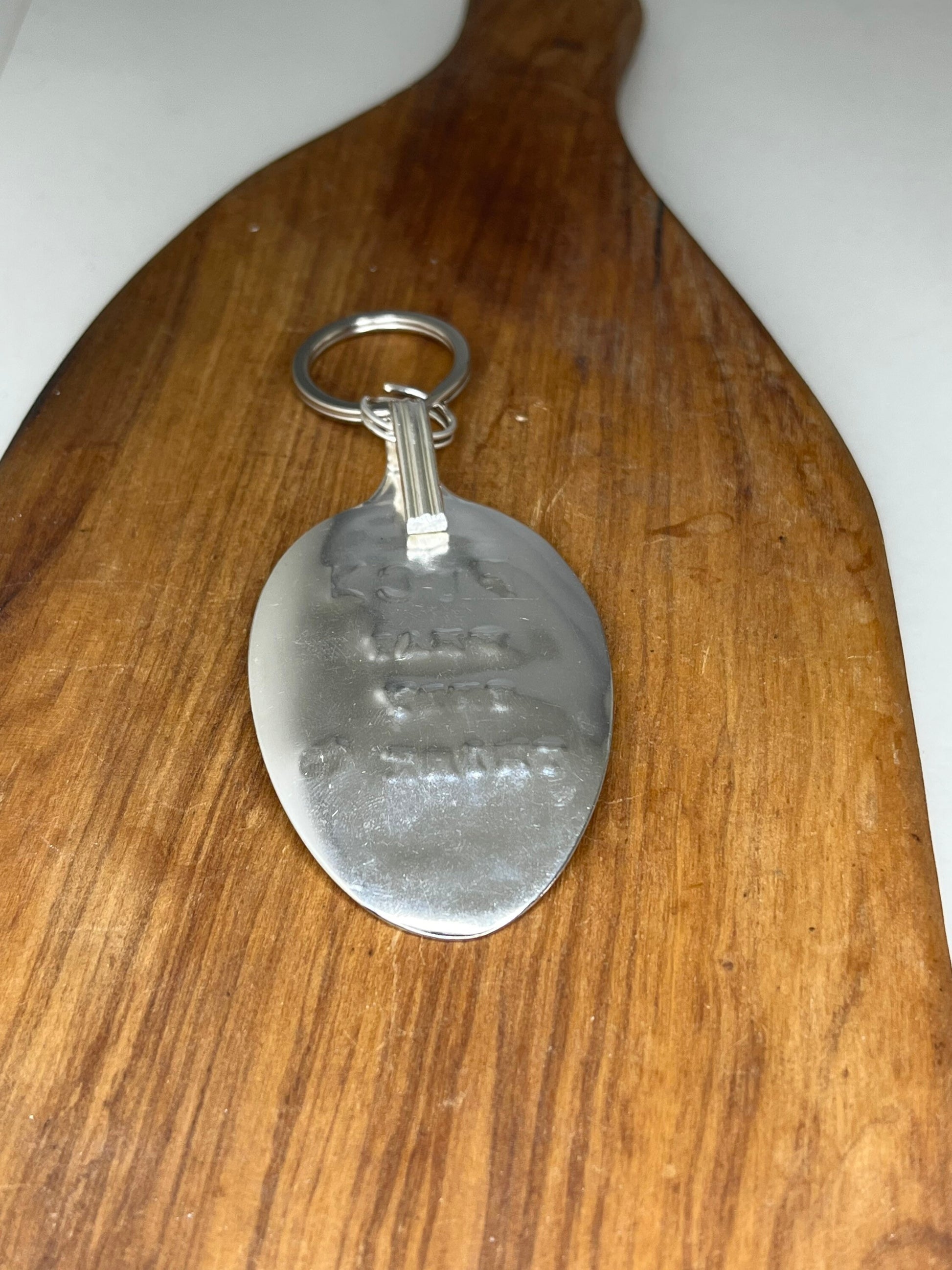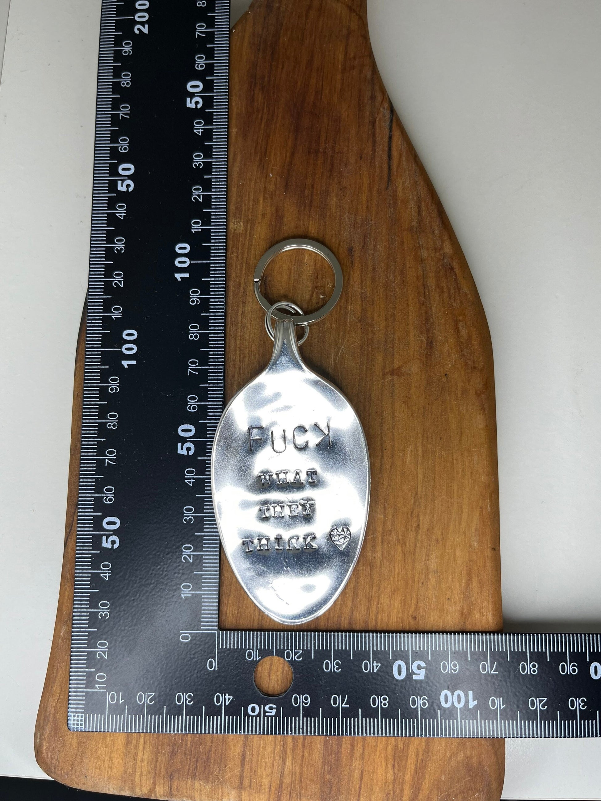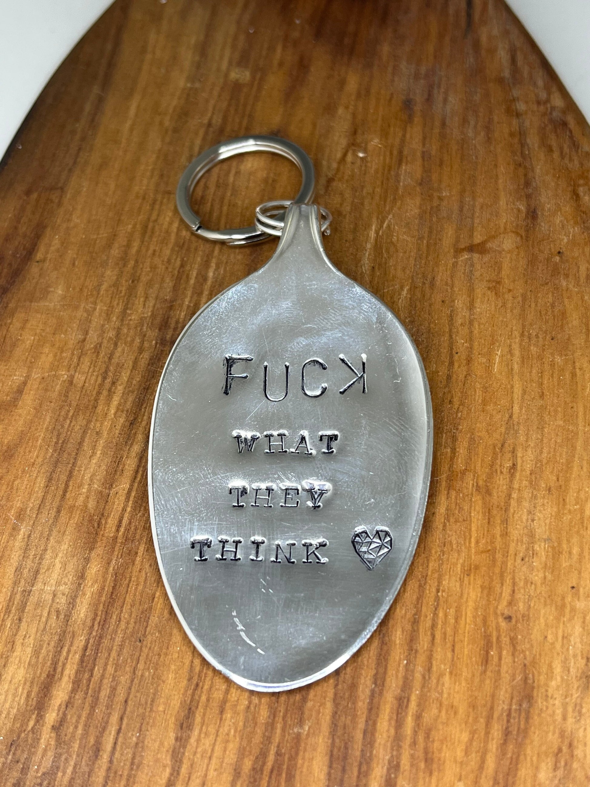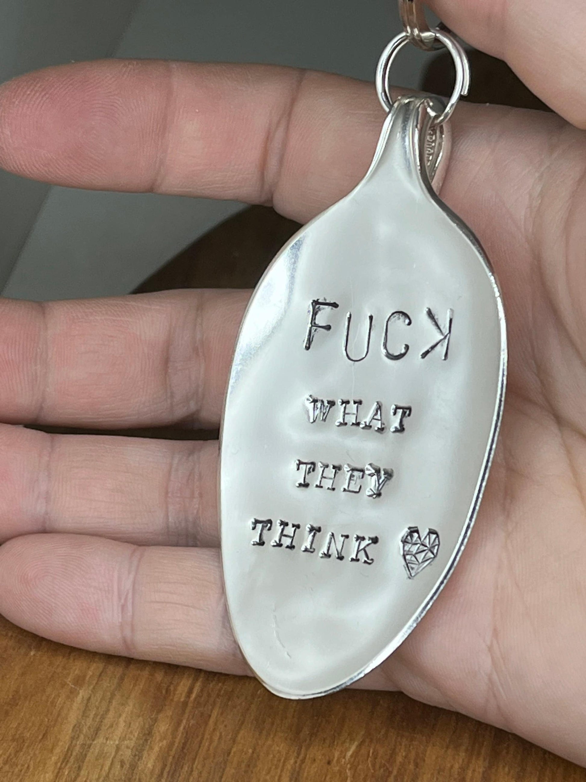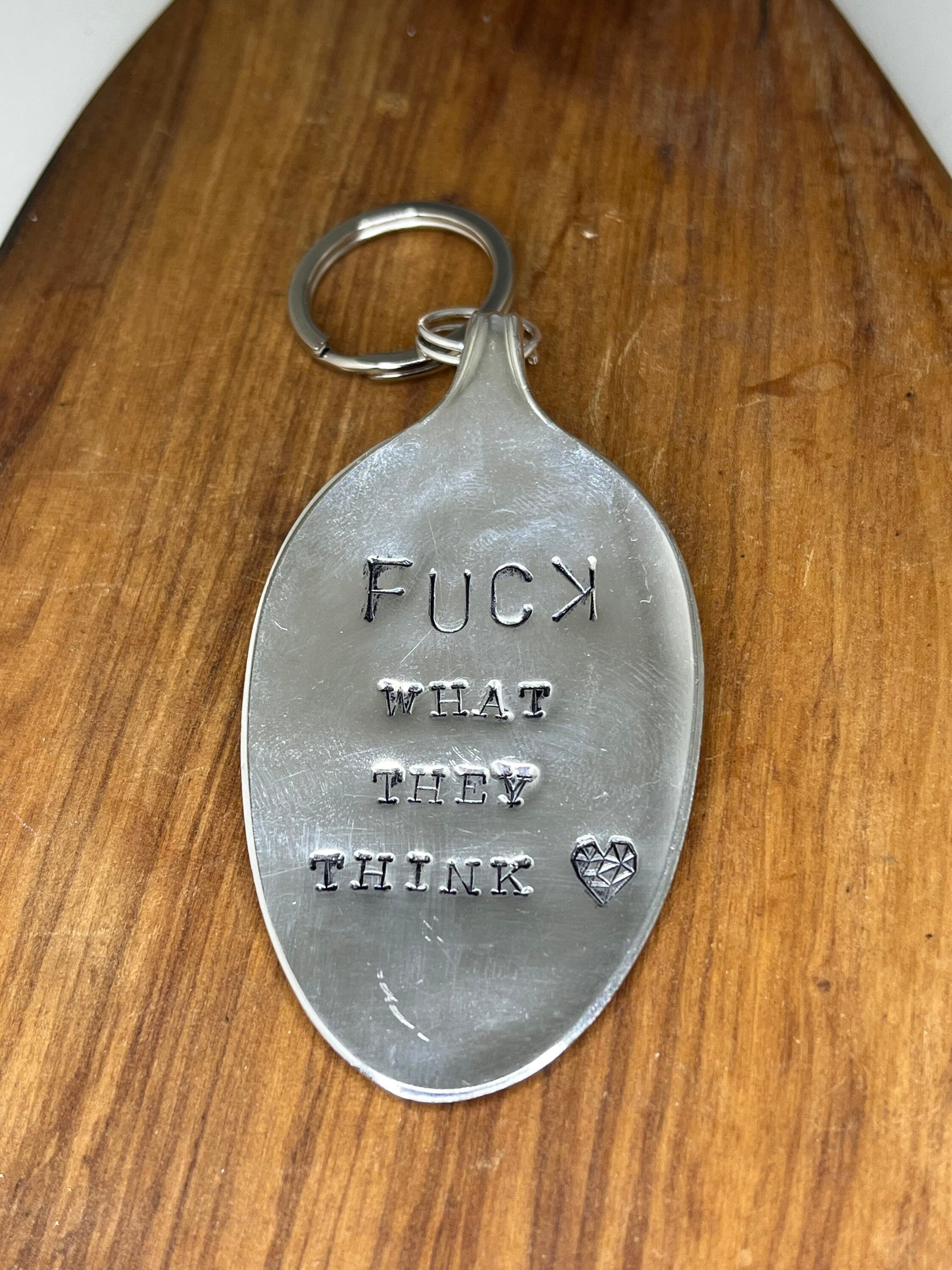 Personalized Keychain made from vintage silver spoon bowl with the quote “Fuck what they think” hand stamped. This has been hammered down by hand, hand polished and stamped one letter at a time. A perfect gift for any strong person in your life.