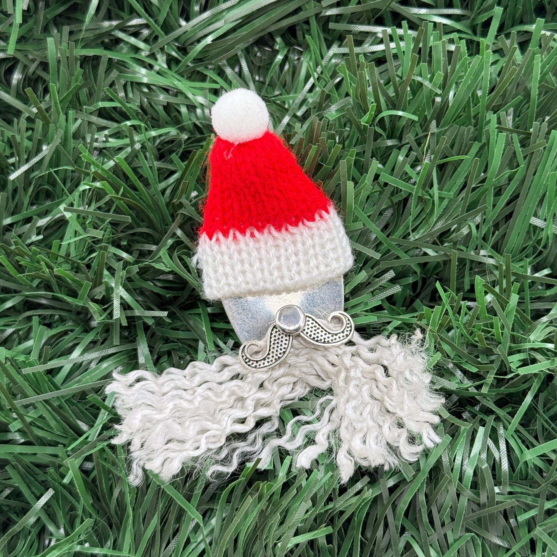 This Christmas Tree Santa decoration was made from an antique spoon bowl that has been flattened, cut, and added a cozy knitted hat and retired rock climbing rope for a beard.