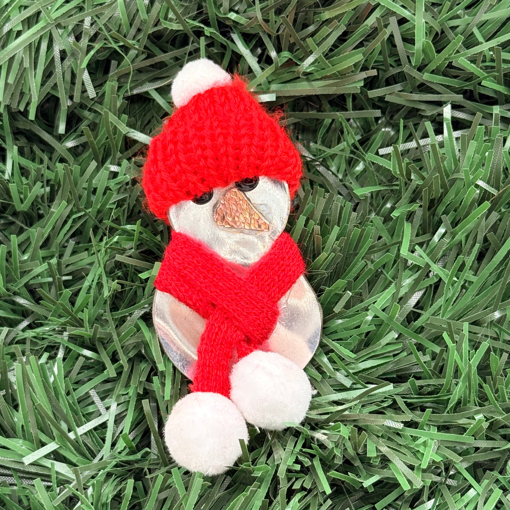 This Christmas Tree decoration was made from an antique spoon bowl that has been flattened, cut, soldered a copper nose and added black rivet eyes and a cozy knitted hat and scarf to complete the look.