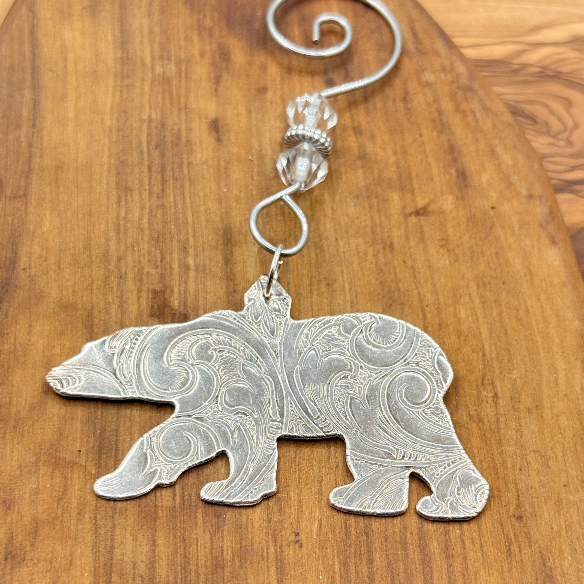 This silver Christmas tree ornament is handmade out of vintage or antique silver plated serving trays or platters with a beautiful hook to hang it in your tree. No extra crystals on this.