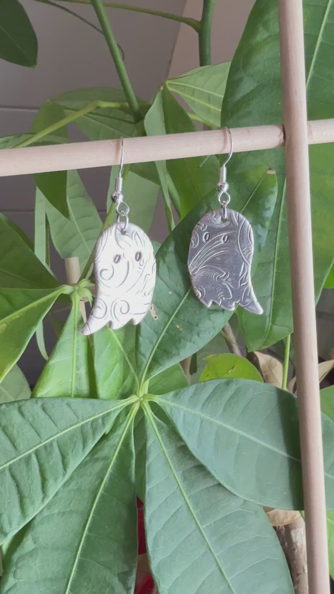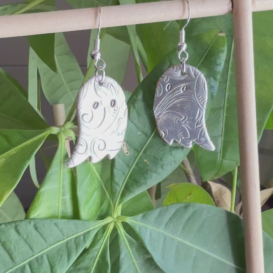 These silver ghost earrings were handmade by me using antique silver plated serving trays. They were cut, sanded and polished by me to give a beautiful silly spooky finish.