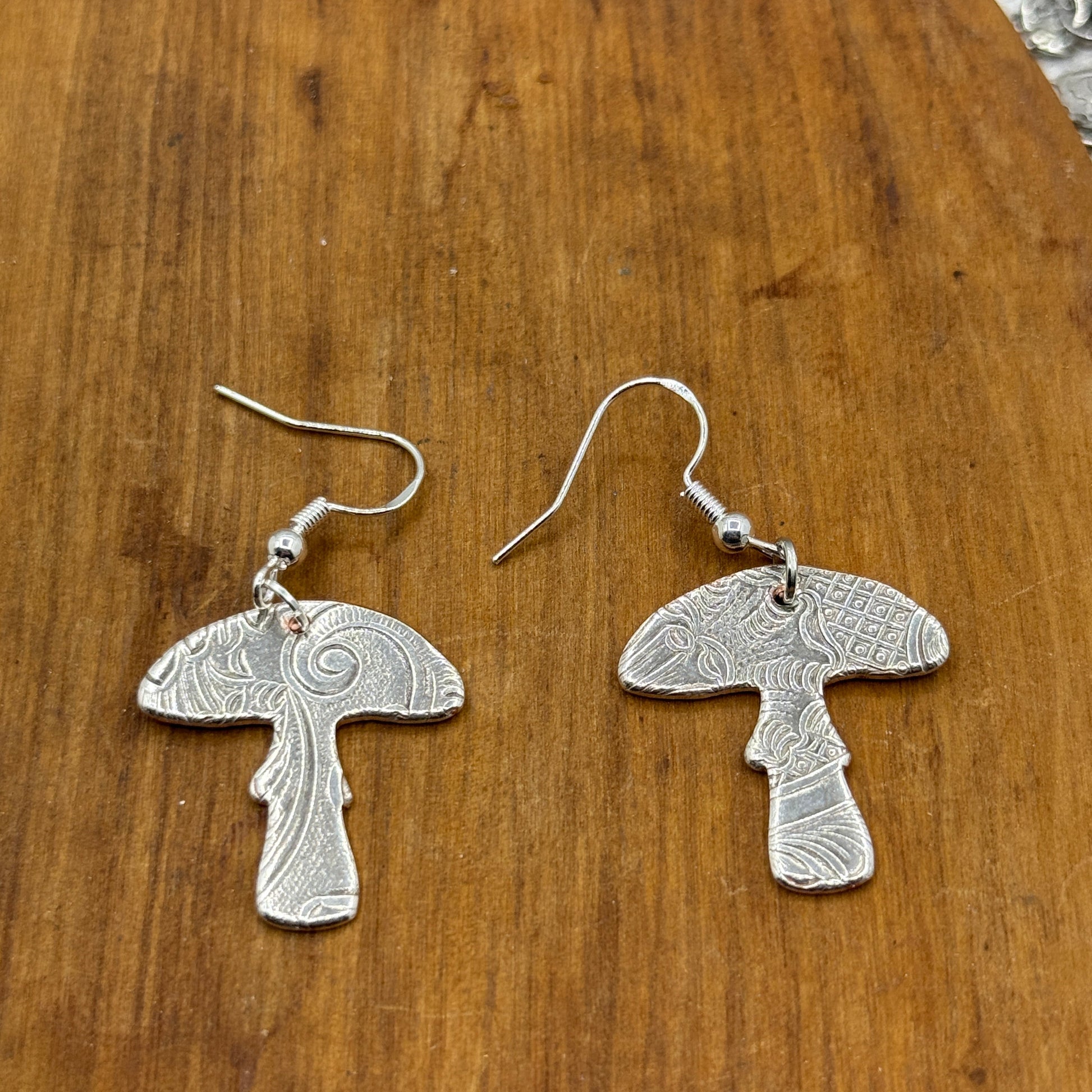 These silver mushroom earrings were handmade by me using antique silver plated serving trays. They were cut, sanded and polished by me to give a beautiful finish.