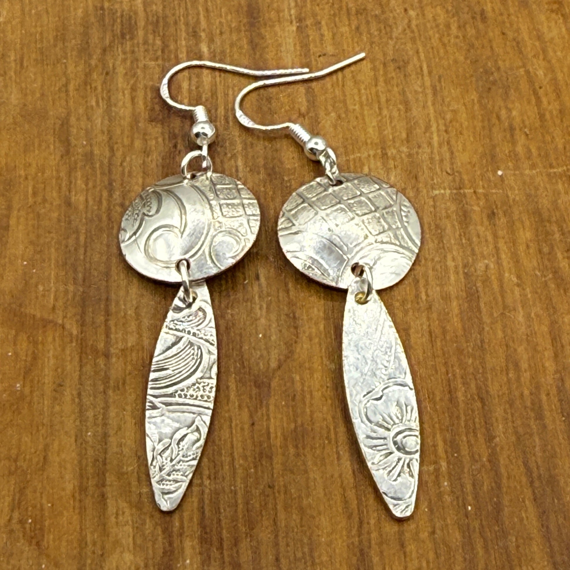 Silver Earrings made from antique silver serving trays and hand cut, assembled and polished by me.